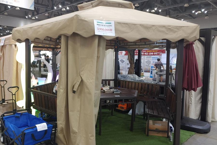 이동식 주택을 보는데 "이런 전시장에는 6평짜리 농막뿐이 안 나온다. 그보다 큰 주택은 안 나와서 아쉽다"라고 말하는데 한쪽 구석에 거대한 목조주택이 보이더군요.