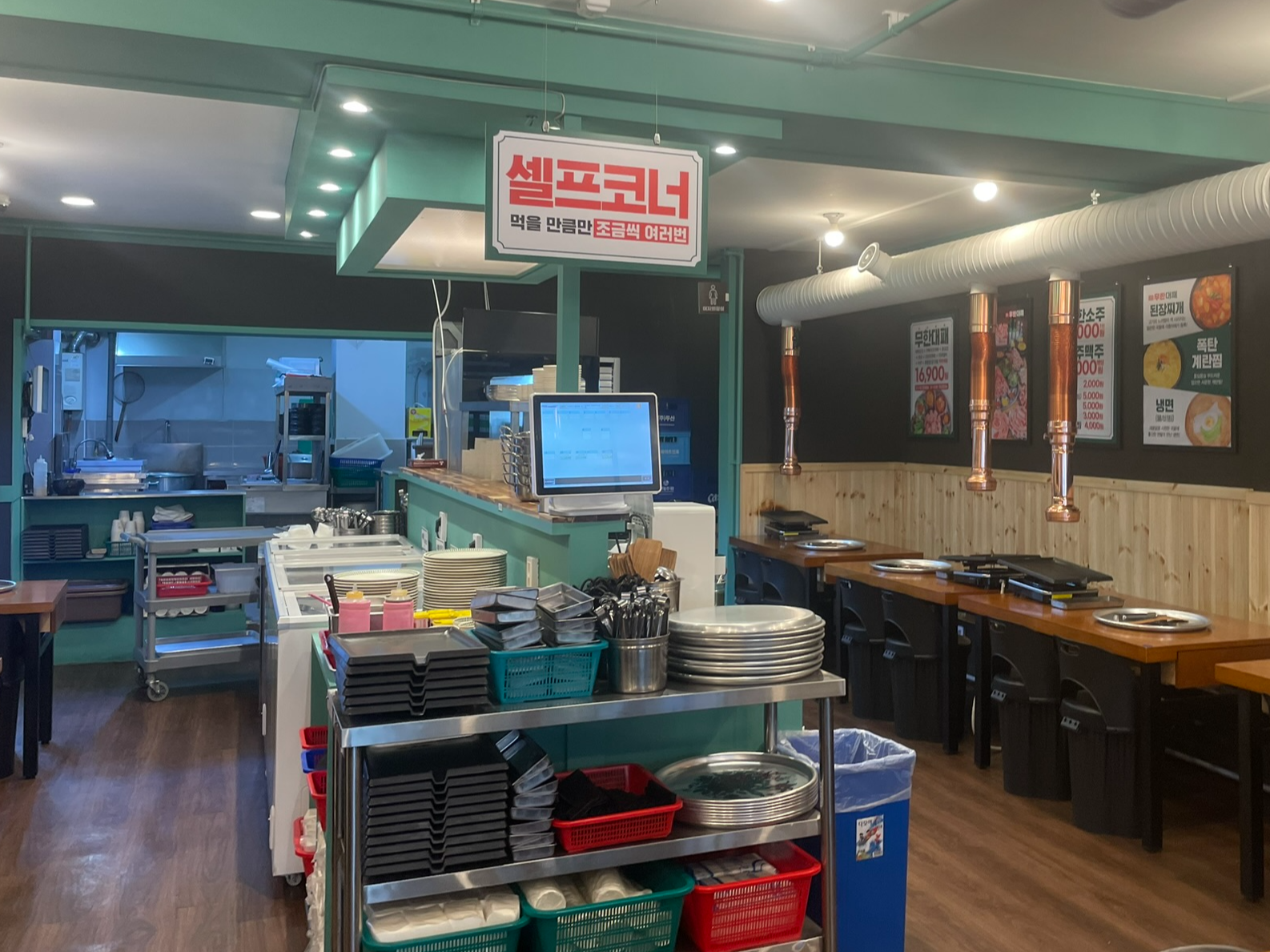 냉동삼겹살이 메인이다 보니 복고가 콘셉트인지 테이블마다 옛날에 볼 법한 쟁반이 놓여있습니다.