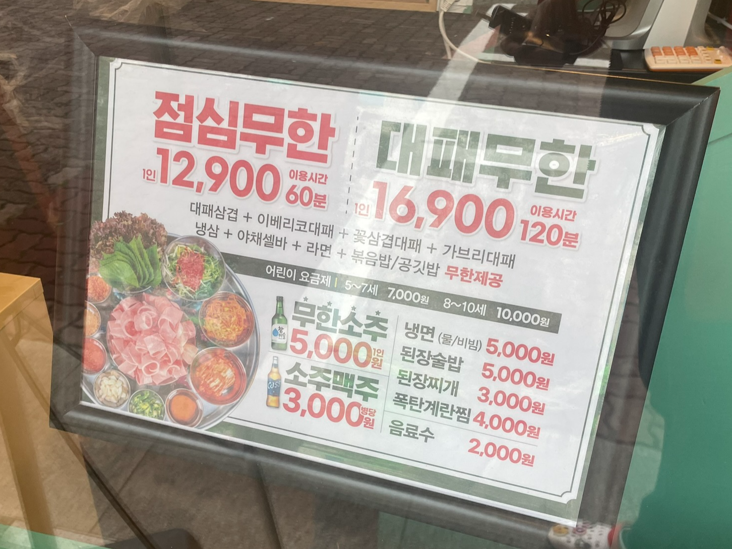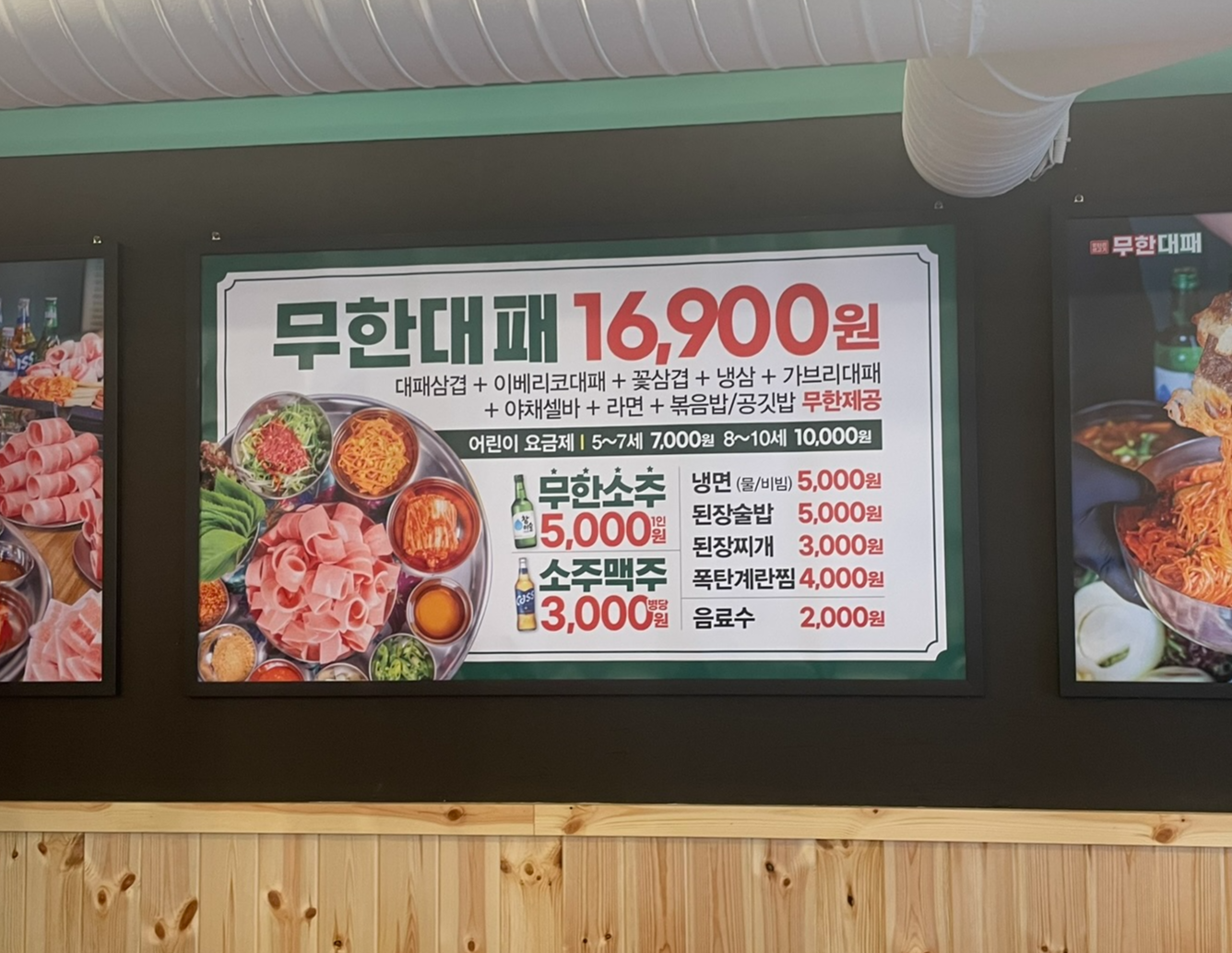 무한리필 가격은 16,900원, 소주맥주 3000원 거기에 무한소주는 인당 5000원