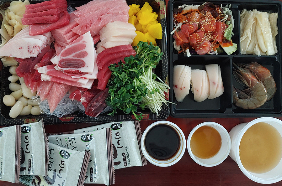 참치회와 곁들이찬으로 참치회무침, 백김치, 초밥, 새우장, 장국이 있었습니다.
